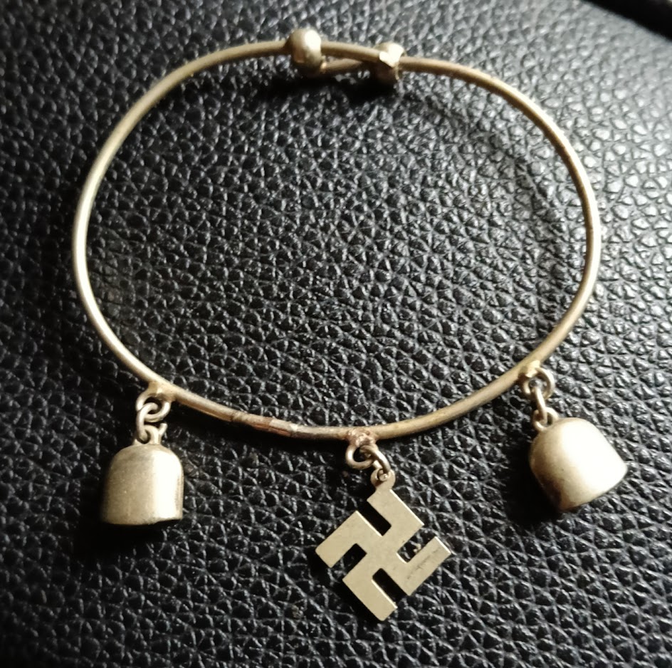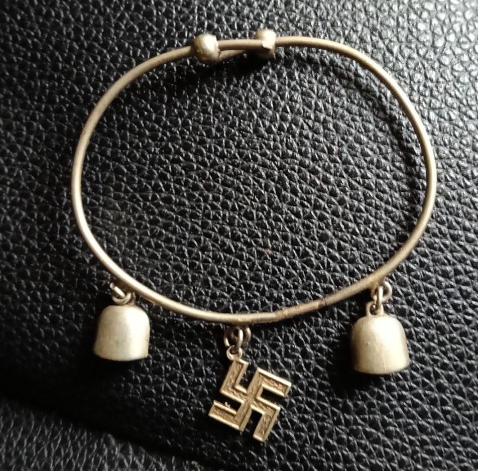 Usually ‘Good Luck’ symbols are flat but this has a mobile Swastika. Item has been repaired.